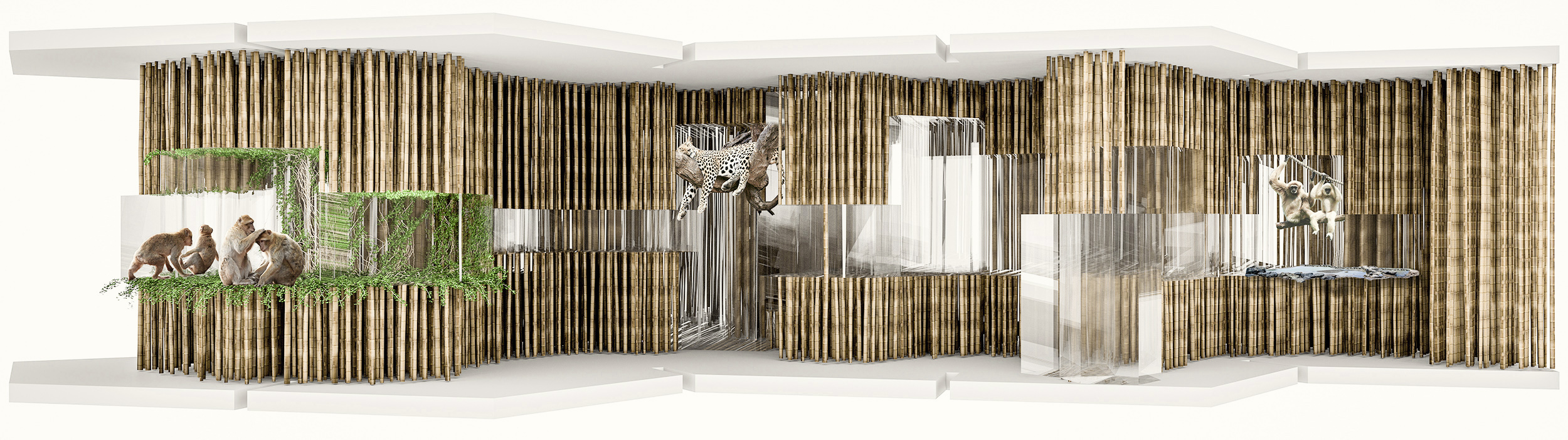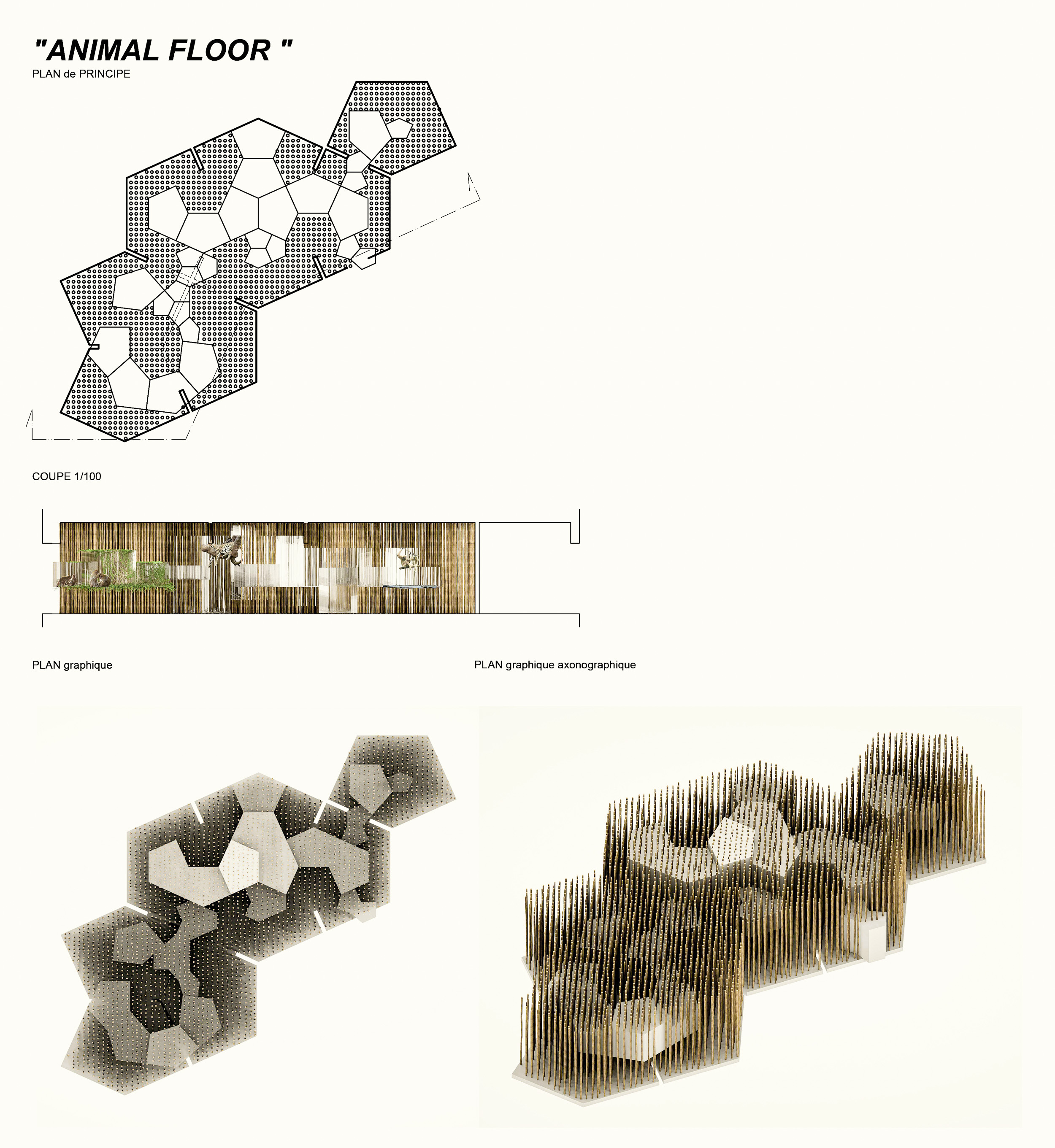 Animal floor est une incursion utopique à l’intérieur d’un ensemble construit telle une ville verticale. Cet étage est entièrement dédié à l’habitat d’animaux non domestiqués. A l’intérieur de cette ville verticalisasée, les fauves ont l’usage exclusif d’un étage entièrement dessiné pour leur bien-être. Une forêt de bambous très dense organise des cavités pour chaque espèce avec des zones de refuges, de repos et de croisement entre les espèces tout en garantissant un échange sécurisé par une répartition définie du territoires des uns et des autres. Les habitants de la ville verticale traversent cet étage par les circulations générales de l’immeuble. L'Animal Floor s’inscrit comme un domaine réservé dans l’arche du vivant et comme un sanctuaire de la préservation des espèces en voix d’extinction.